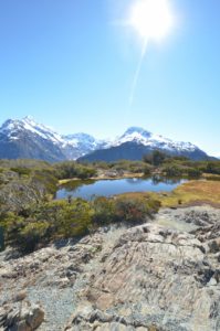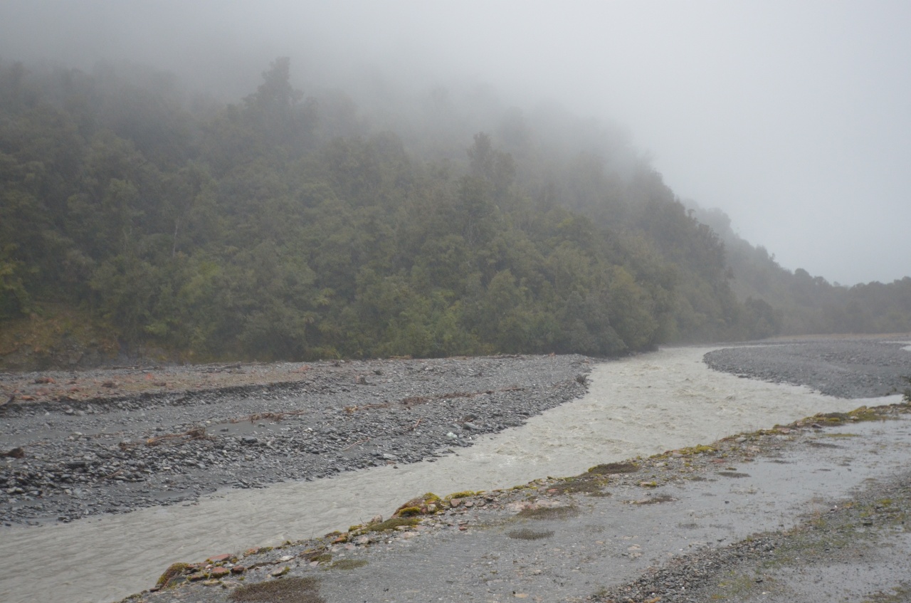 Weiter gings zum Franz-Josef-Glacier. Am Abend hatten wir eine tolle Aussicht auf die Gletscher. Wir haben uns noch schnell einen Ort zum Übernachten gesucht und auf eine Wanderung am nächsten Tag gefreut – nix da, es begann zu regnen. Es hat so fürchterlich geregnet, dass unser Auto in einer riesen Pfütze – fast einem See – aufgewacht ist. Man hat kaum 50 Meter weit gesehen… Das neben uns gestern noch ein Gletscher war, konnten wir nicht glauben… Aus unserem Plan, wandern zu gehen, wurde also nichts. Da der Wetterbericht keine Besserung in den nächsten Tagen vorhersagte, haben wir uns entschieden, ins Landesinnere, dem guten Wetter hinter herzufahren.
