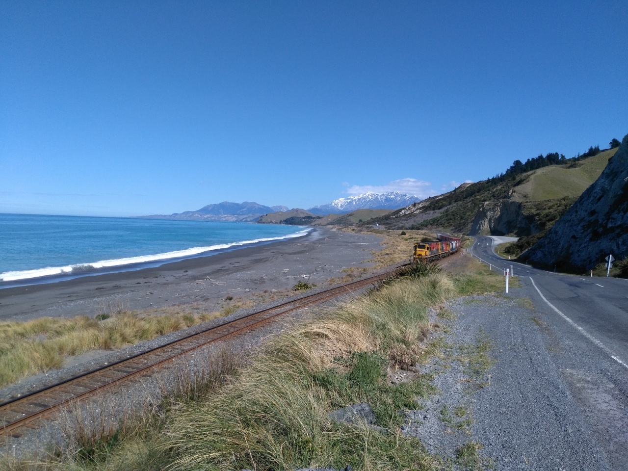 Nach dem Wandertag haben wir uns auf Grund eines Tipps nach Kaikoura begeben. Da sieht man angeblich auf alle Fälle Delphine. Nix da… Keine Delphine… Aber immerhin hat sich auf dem Weg dahin einer der seltenen neuseeländischen Züge gezeigt und jede Menge Robben. In Kaikoura haben wir uns wieder eine kleine 10 km Wanderung – Peninsula Walkway – gegönnt, was unsere Füße im Nachhinein nicht so super gefunden haben. Das Lustige an dem Walk waren die Robben, die sind an mehreren Stellen im Weg gelegen und eine davon wurde aktiv bewacht.