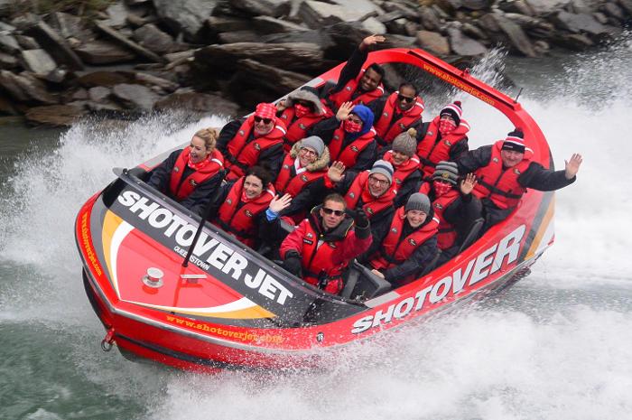 Queenstown war aufregend. Seit Wellington waren wir endlich mal wieder in einer kleinen Stadt, die uns sehr gut gefallen hat. Es war unheimlich viel los, gab tolles Essen und schöne Plätze. Man kann hier so gut wie alles machen: Heli- und Flugzeugrundflüge, Fallschirm- und Bungeesprünge, Jetboattouren und Paragleiten. Wir haben uns für eine Jetboattour durch den Shotover River angemeldet. Man fährt mit einem kleinen Boot, das zu einem großen Teil aus einem 700 PS Jetmotor besteht, durch einen kleinen Canyon – es war wirklich aufregend, vor allem die 360° Drehungen.