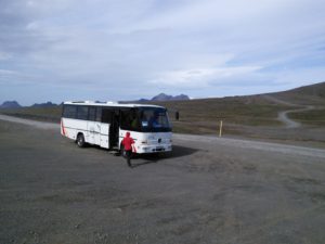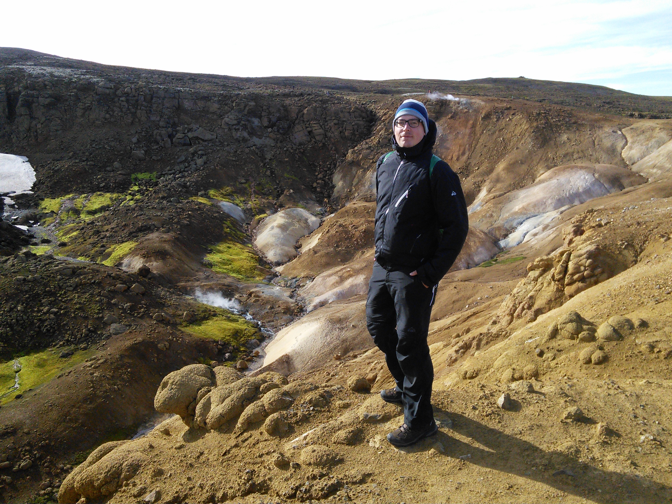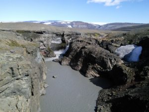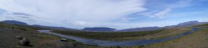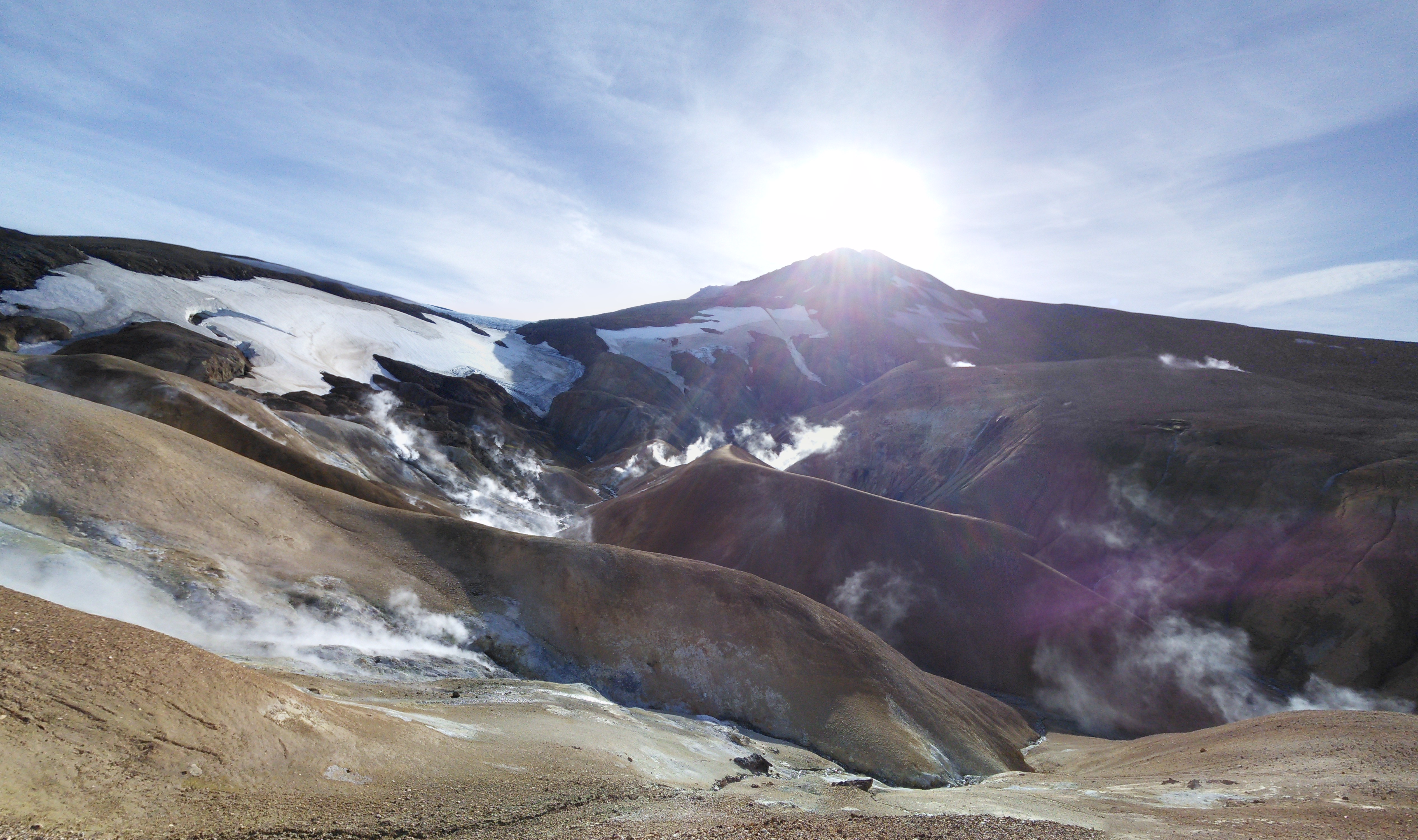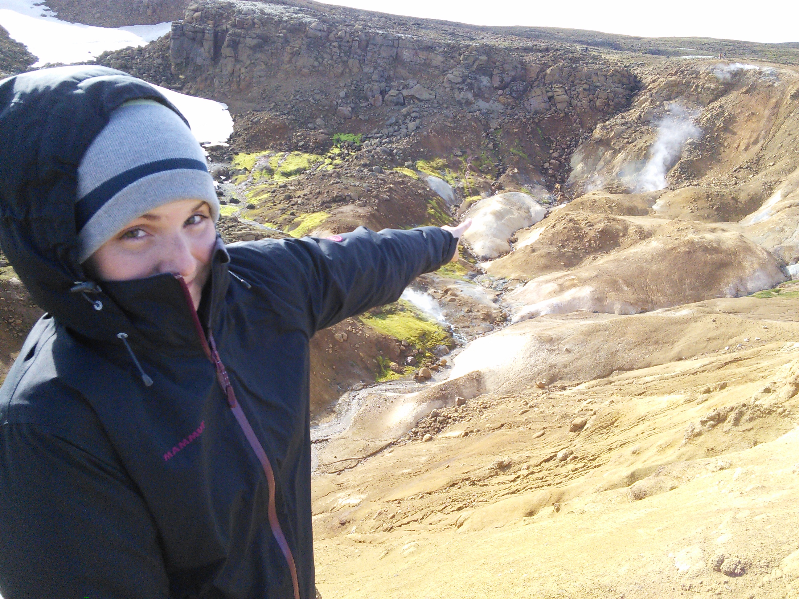 In der Gegend haben wir zwei Wanderungen gemacht, eine zu heißen Quellen in den Bergen und eine Rundwanderung entlang eines Flusses und über einen langgezogenen Bergkamm. Die erste war landschaftlich spektakulär, wir hatten immer die Berge vor uns und gingen an dampfenden und nach Eier stinkenden Löchern und Spalten vorbei, die andere hat uns nahe an einen Gletscher gebracht und uns durch die verschiedensten Landschaften der Hochebene geführt und wir mussten zwei mal unsere Schuhe ausziehen und durch „reißende“ Bäche furten.