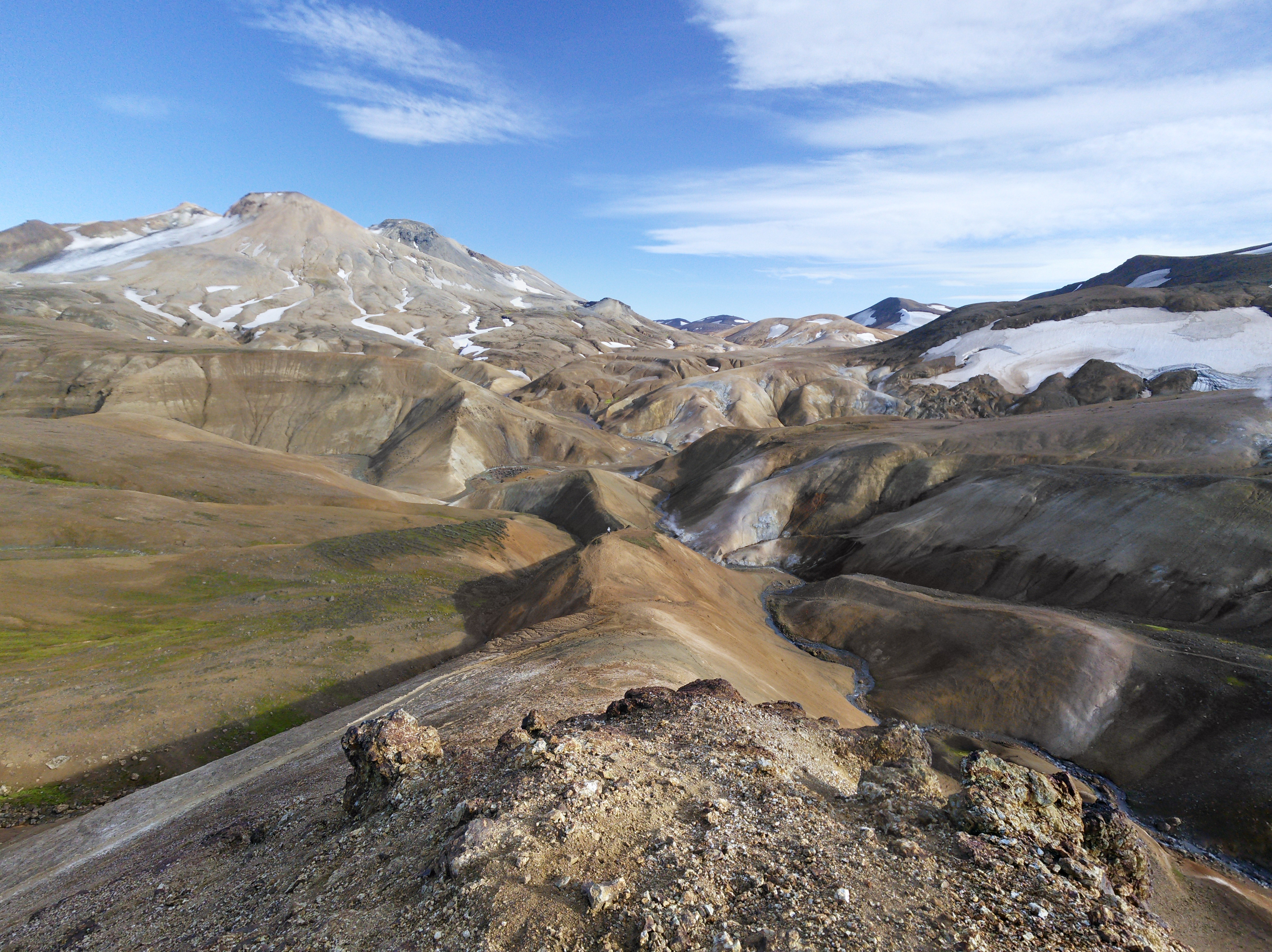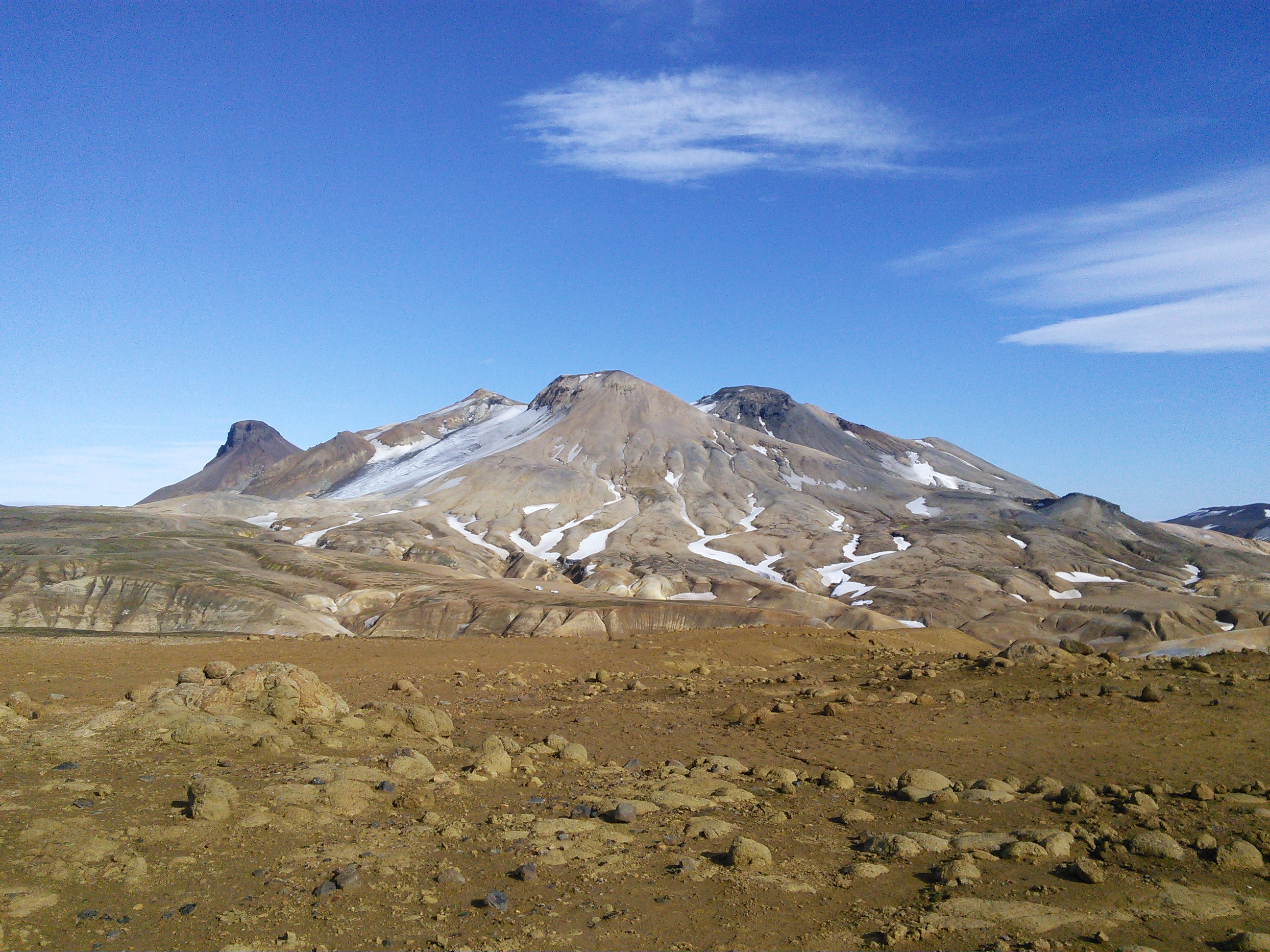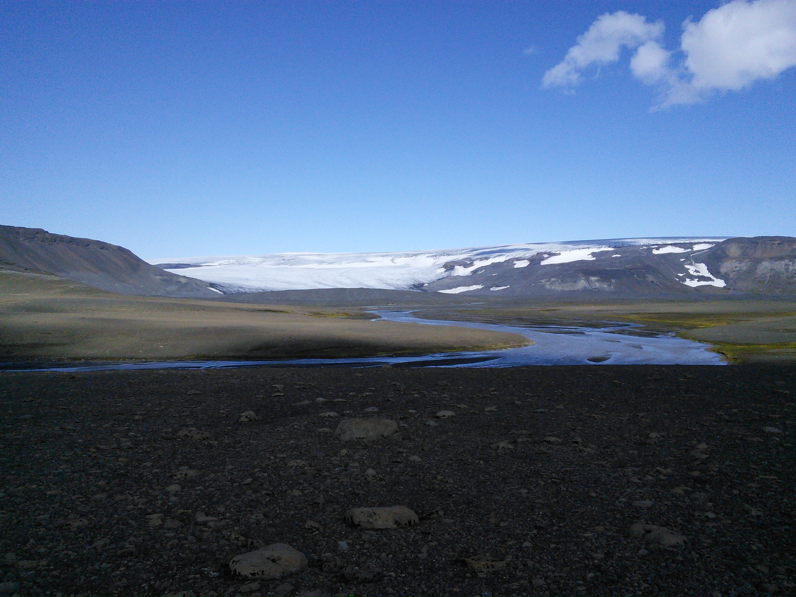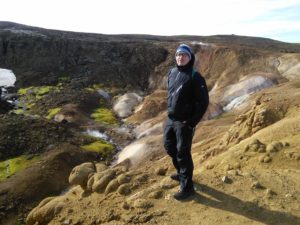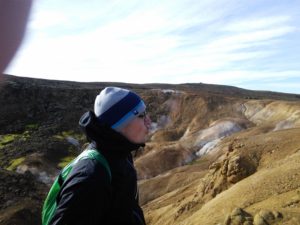 In der Gegend haben wir zwei Wanderungen gemacht, eine zu heißen Quellen in den Bergen und eine Rundwanderung entlang eines Flusses und über einen langgezogenen Bergkamm. Die erste war landschaftlich spektakulär, wir hatten immer die Berge vor uns und gingen an dampfenden und nach Eier stinkenden Löchern und Spalten vorbei, die andere hat uns nahe an einen Gletscher gebracht und uns durch die verschiedensten Landschaften der Hochebene geführt und wir mussten zwei mal unsere Schuhe ausziehen und durch „reißende“ Bäche furten.