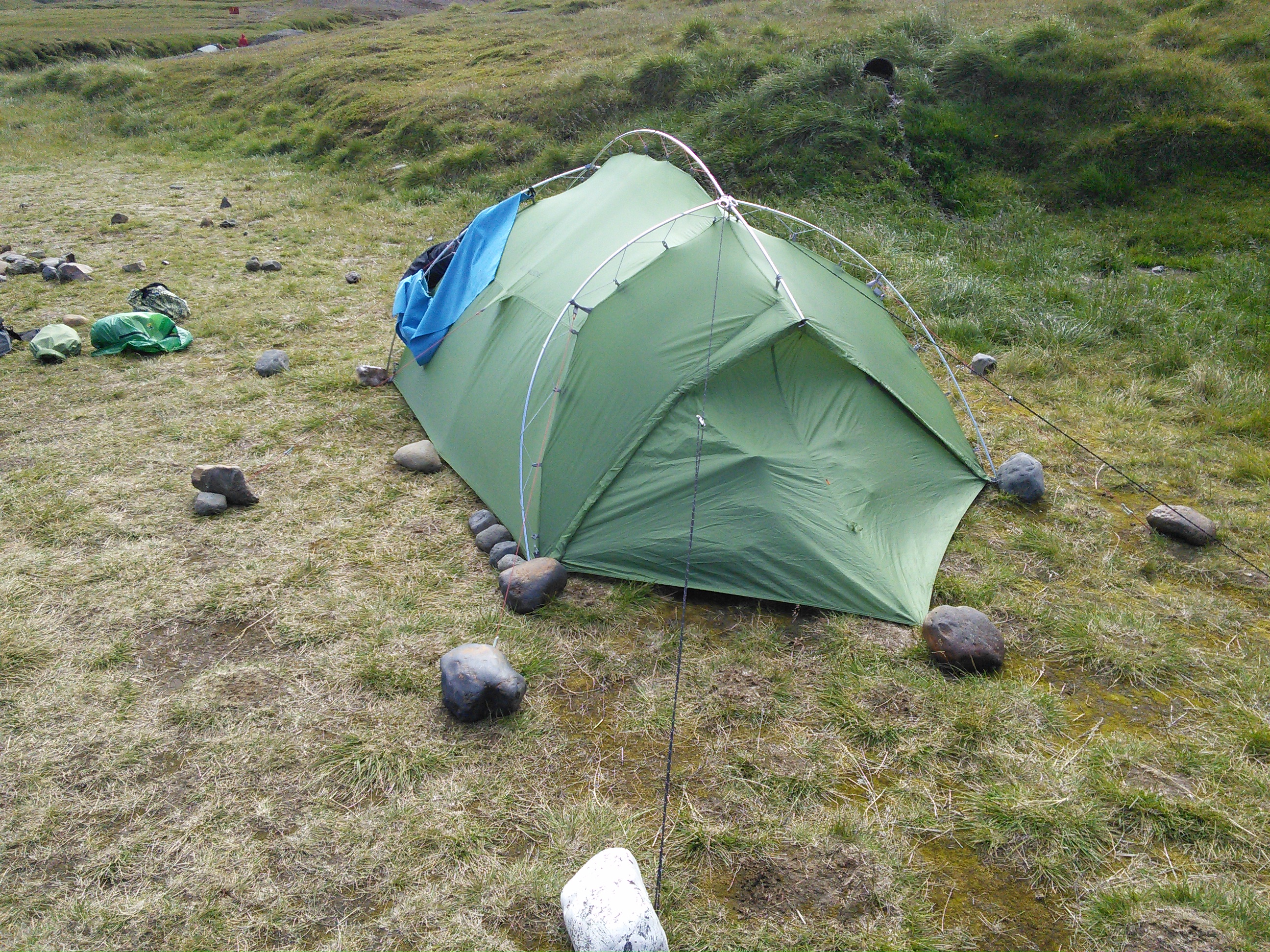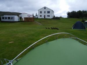 Der Campingplatz von Kerlingarfjöll liegt unheimlich schön am Fuße eines Gebirges, das zwischen zwei Gletschern liegt und deshalb sehr windanfällig ist. Dementsprechend haben wir unser Zelt mit zusätzlichen Leinen und Steinen etwas windsicherer aufgestellt. In der ersten Nacht hatten wir Glück und es war fast windstill, in der zweiten dafür umso windiger.